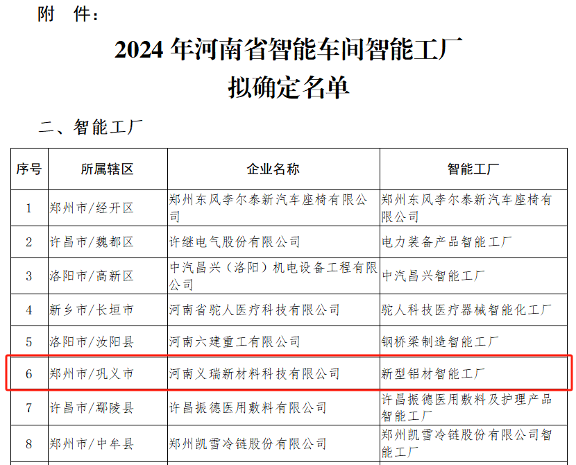 根據《河南(nán)省加快數字(zì)化轉型推動製造業高端化智(zhì)能化綠(lǜ)色化發展(zhǎn)行動計(jì)劃(2023—2025年)》(豫政〔2023〕32號(hào))、《河南(nán)省製造強省建設領導小組辦公室關於印發2024年河南省加快數字化轉型推動製(zhì)造業高端化智能(néng)化綠(lǜ)色化發展(zhǎn)工作(zuò)方案的通知》(豫製造強省辦〔2024〕13號)、《河南省工業和信(xìn)息(xī)化廳辦公室關於開展2024年製(zhì)造業數字化轉型示範遴選工作的通知》(豫工信辦〔2024〕30號)等文件要求(qiú),經主管部門審核,明泰鋁業(yè)下(xià)屬子公司河南義瑞新材料科技有限公司新型鋁(lǚ)材智能工廠被評為“2024年(nián)河南省智能工廠”。