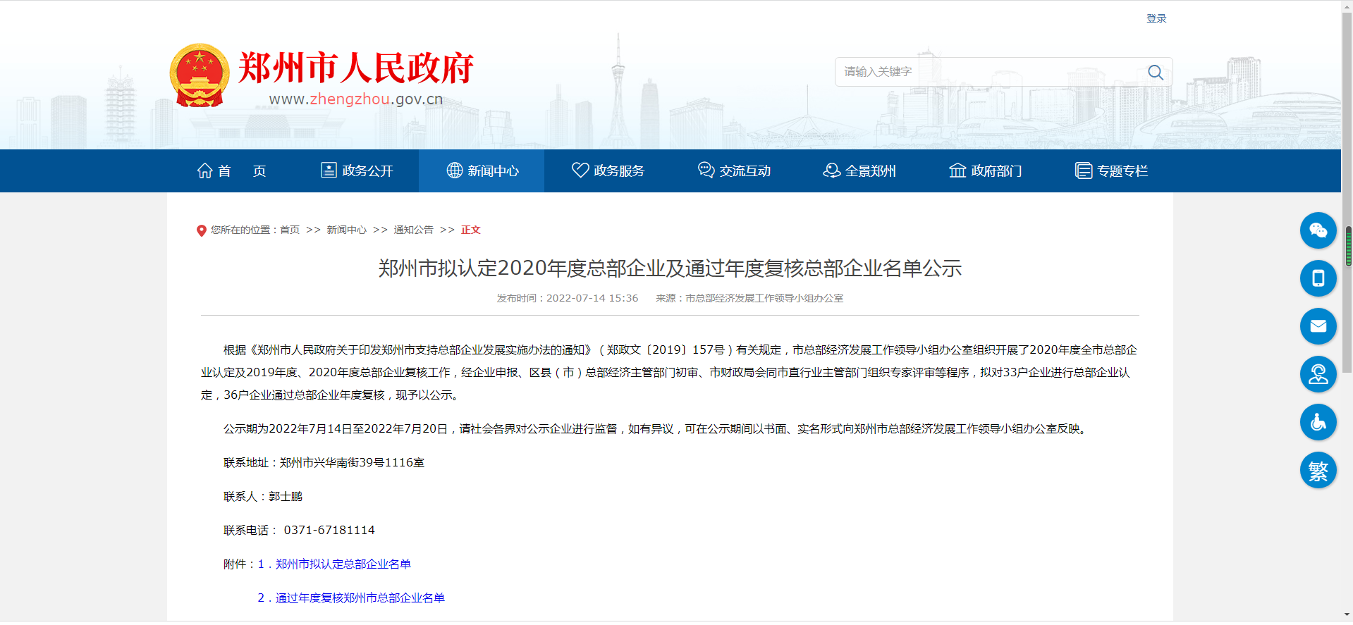 近日,根據(jù)《鄭州市人民政府關於印發鄭州市支持總(zǒng)部企(qǐ)業發展實施辦法的通(tōng)知》(鄭(zhèng)政文〔2019〕157號)有關規定,鄭(zhèng)州市總部經濟發(fā)展工作領導小組辦公室組織開展了2020年(nián)度全市總(zǒng)部企業認定及2019年度、2020年度(dù)總部企業複核工作,經(jīng)企業申報、區縣(xiàn)(市)總部經濟主管部門初審、市財政局會同(tóng)市直行業主管部門(mén)組織專家評審等程序,擬對33戶企業進行總部企業認(rèn)定,河南明泰鋁(lǚ)業股份有限公司位列(liè)名單之中。